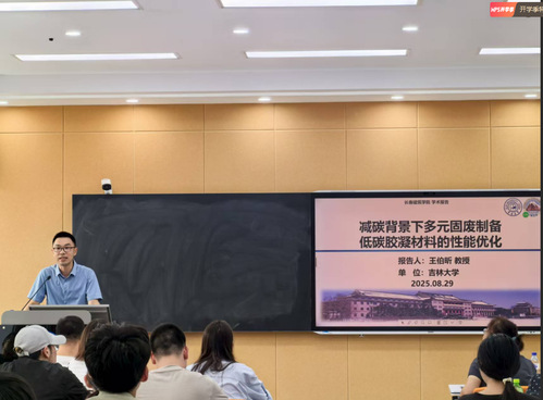 为贯彻落实学校“三个三”发展战略部署,提升教师科研能力,增强整体科研实力,推动学校科研水平迈上新台阶,由学校科研处牵头,各学院(部)相继组织承办学术交流系列活动。官网特开设专栏,连续刊载2025年度科研能力提升系列活动,为教师们搭建学习平台,也为学校教育教学创新注入新活力。第二十六期由土木工程学院承办。近日,土木工程学院邀请吉林大学王伯昕教授作“减碳背景下多元固废制备低碳胶凝材料的性能优化”专题学术讲座。学院全体教师与部分学生参加。